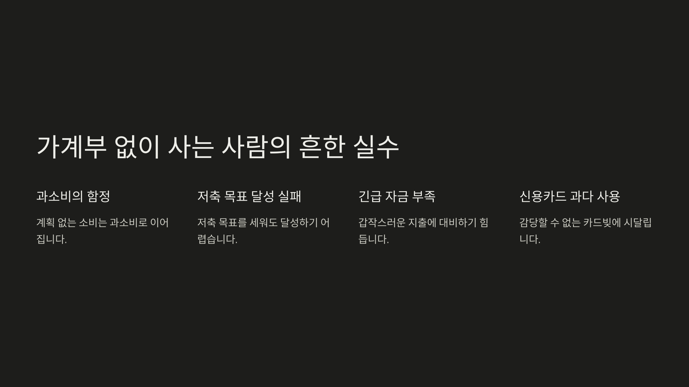 | 지출 기록 없음 | 어디에 돈을 썼는지 모름 | 가계부 작성 습관 들이기 |