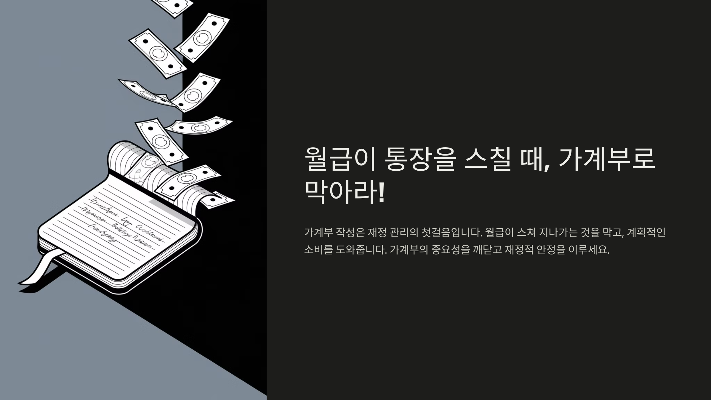 "이번 달에 얼마나 썼더라?"라고 생각해 본 적 있나요? 🤔 수입과 지출을 기록하지 않으면, 자신이 어디에 얼마나 돈을 쓰고 있는지 제대로 알 수 없어요. 결국 필요 없는 곳에 돈을 많이 쓰고 있다는 걸 깨닫지 못하게 되죠.