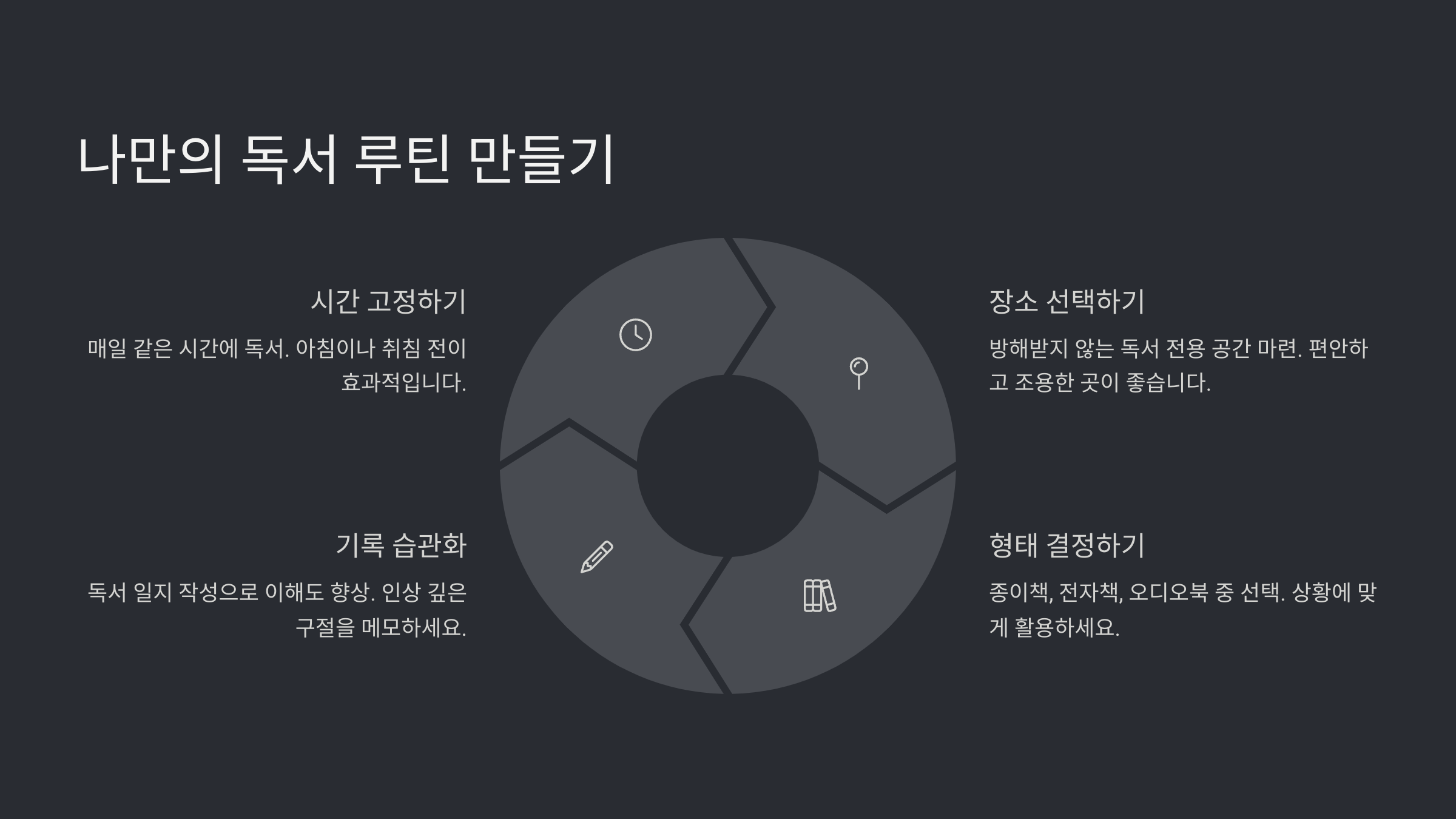 루틴은 습관보다 더 강력해요. 하루를 구조화하고 자동으로 행동하게 만들어주니까요. 독서 루틴을 만들기 위해선 아침 기상 직후, 식사 후, 잠들기 전 같은 ‘고정된 시간대’를 활용하는 게 효과적이에요.