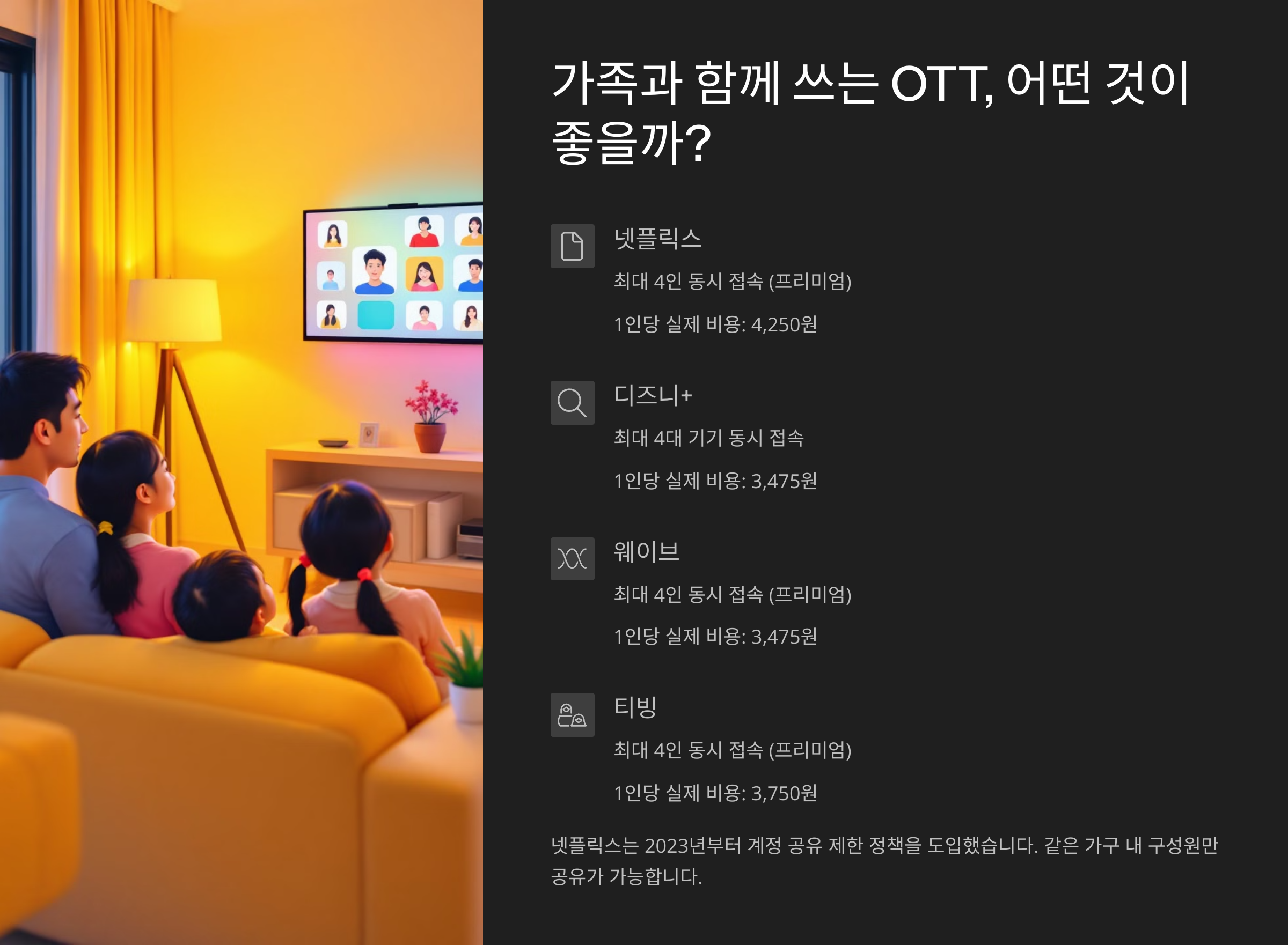 또한, 국내 OTT는 가족 공유가 자유롭지만, 넷플릭스 같은 해외 OTT는 같은 가구 내에서만 계정을 공유할 수 있도록 제한하고 있어요. 따라서 가족끼리 공유할 계획이라면 국내 OTT가 더 유리하죠! 🏡