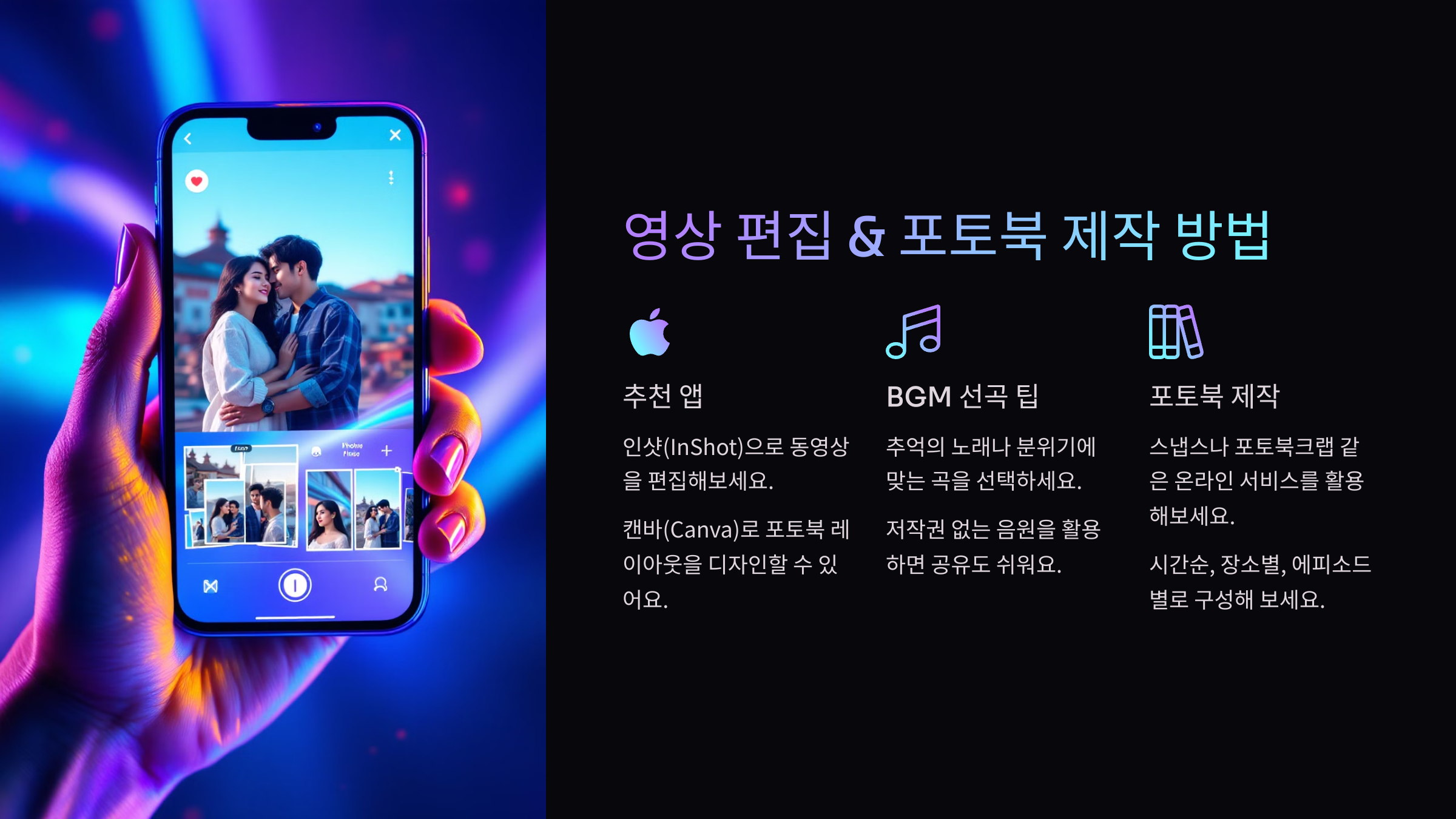 커플룩까지 준비했다면, 이제 기념일을 더욱 특별하게 남길 수 있는 영상 편집과 포토북 제작 방법을 알아볼까요? 🎥📖