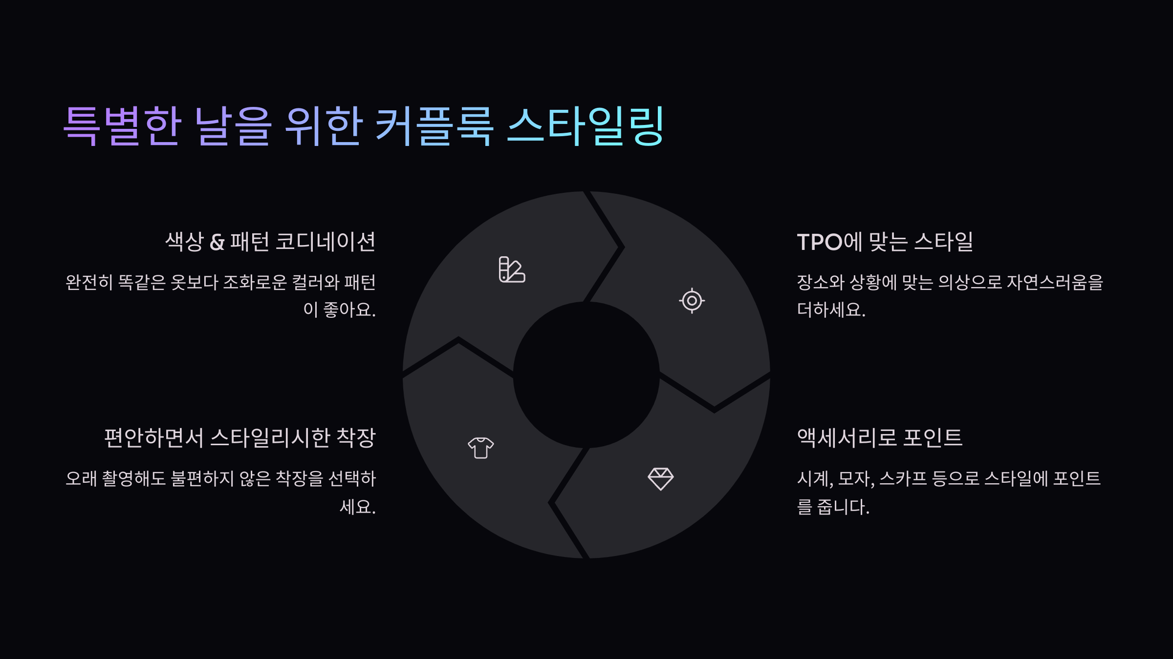 카메라 설정을 알았다면, 이제 기념일을 더욱 특별하게 만들어줄 커플룩 스타일링을 살펴볼까요? 🎀
