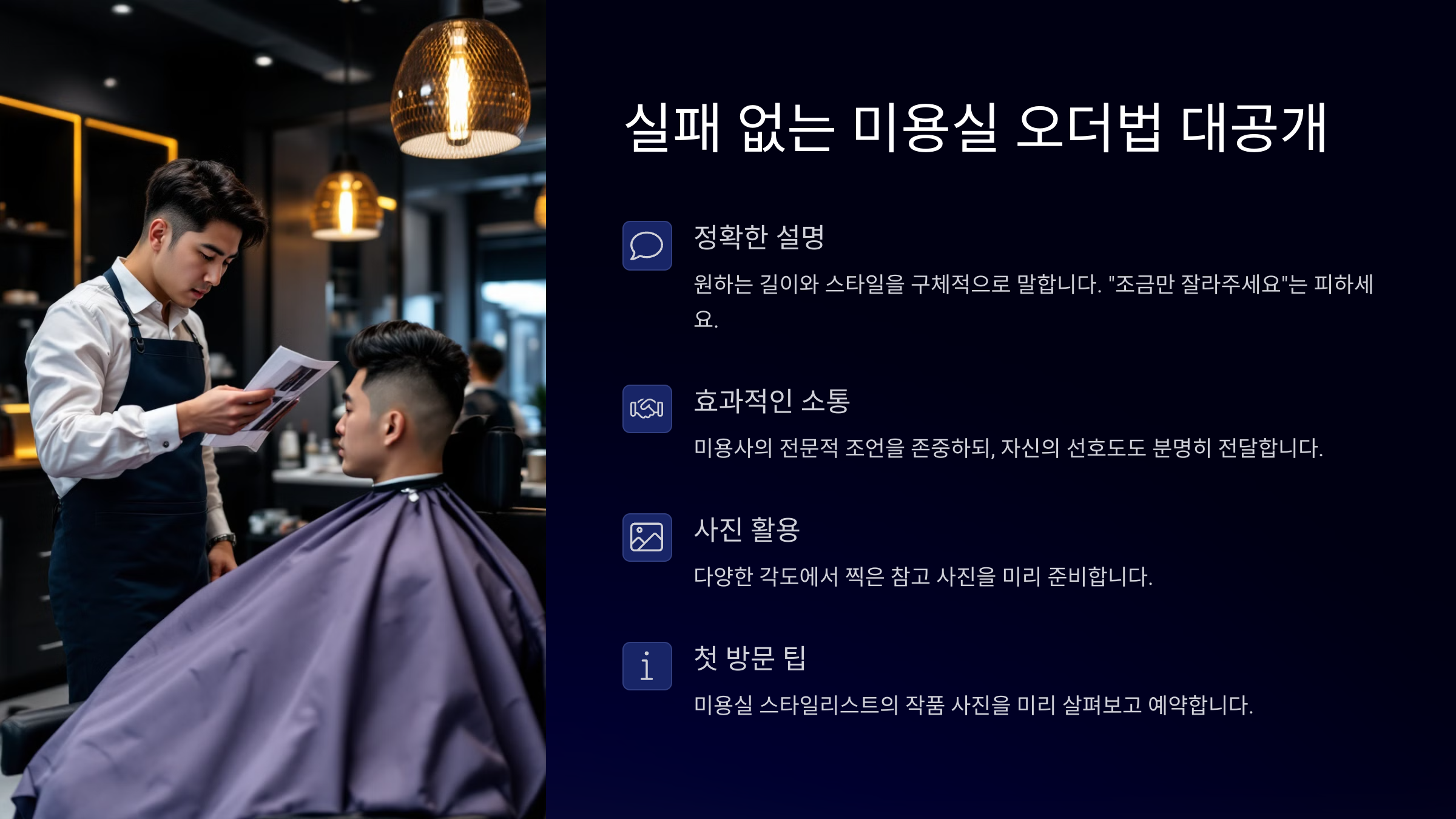| 길이와 질감 강조 | "앞머리는 눈썹 위, 옆머리는 귓불까지" 등 구체적으로 말해요. |