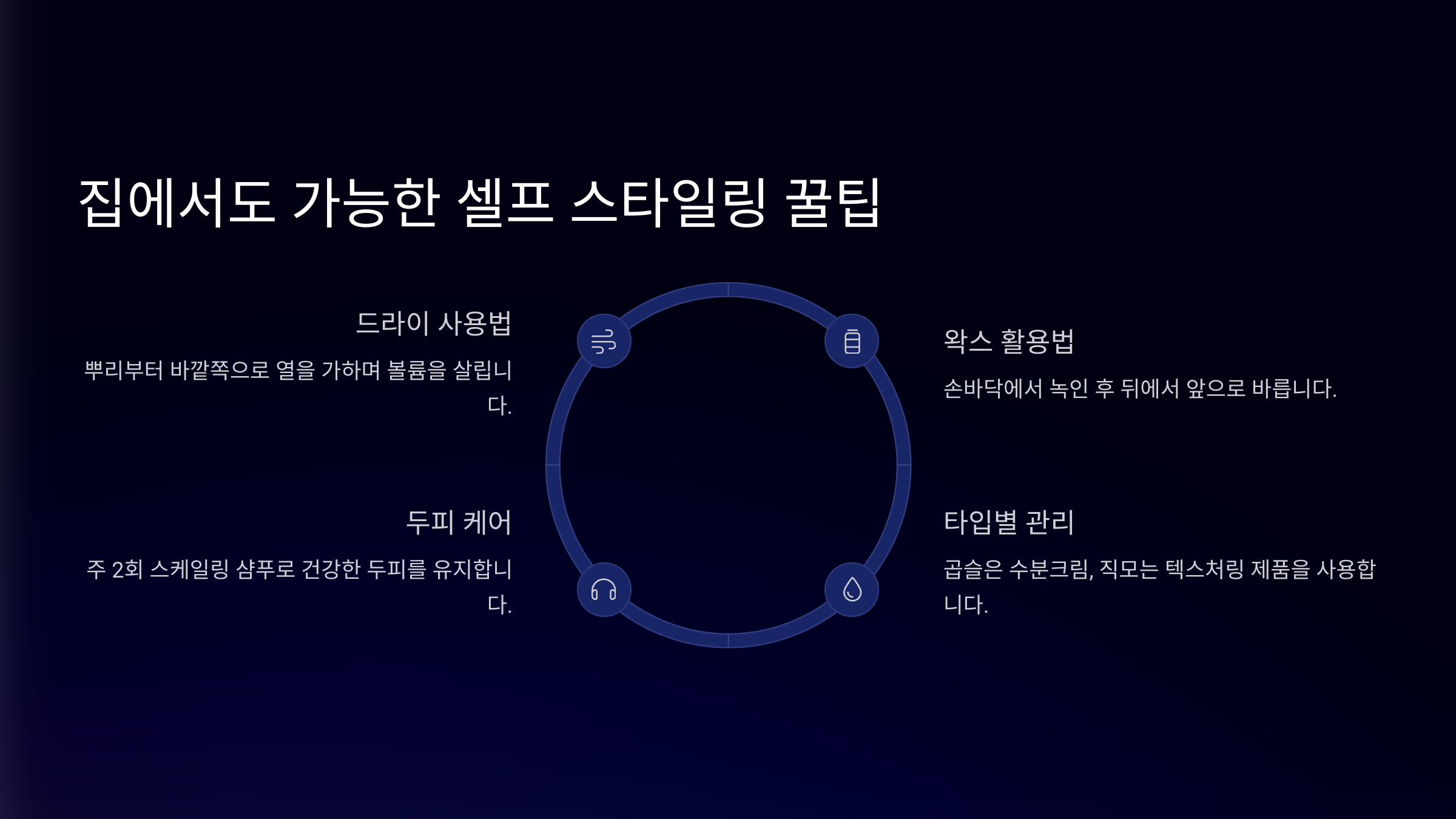 셀프 스타일링에서 가장 중요한 것은 제품을 적절히 사용하는 거예요. 왁스를 너무 많이 바르면 떡지기 쉽고, 드라이기 온도를 너무 높이면 머리카락이 손상될 수도 있어요. 적당한 양과 적절한 사용법이 중요하답니다! 😉