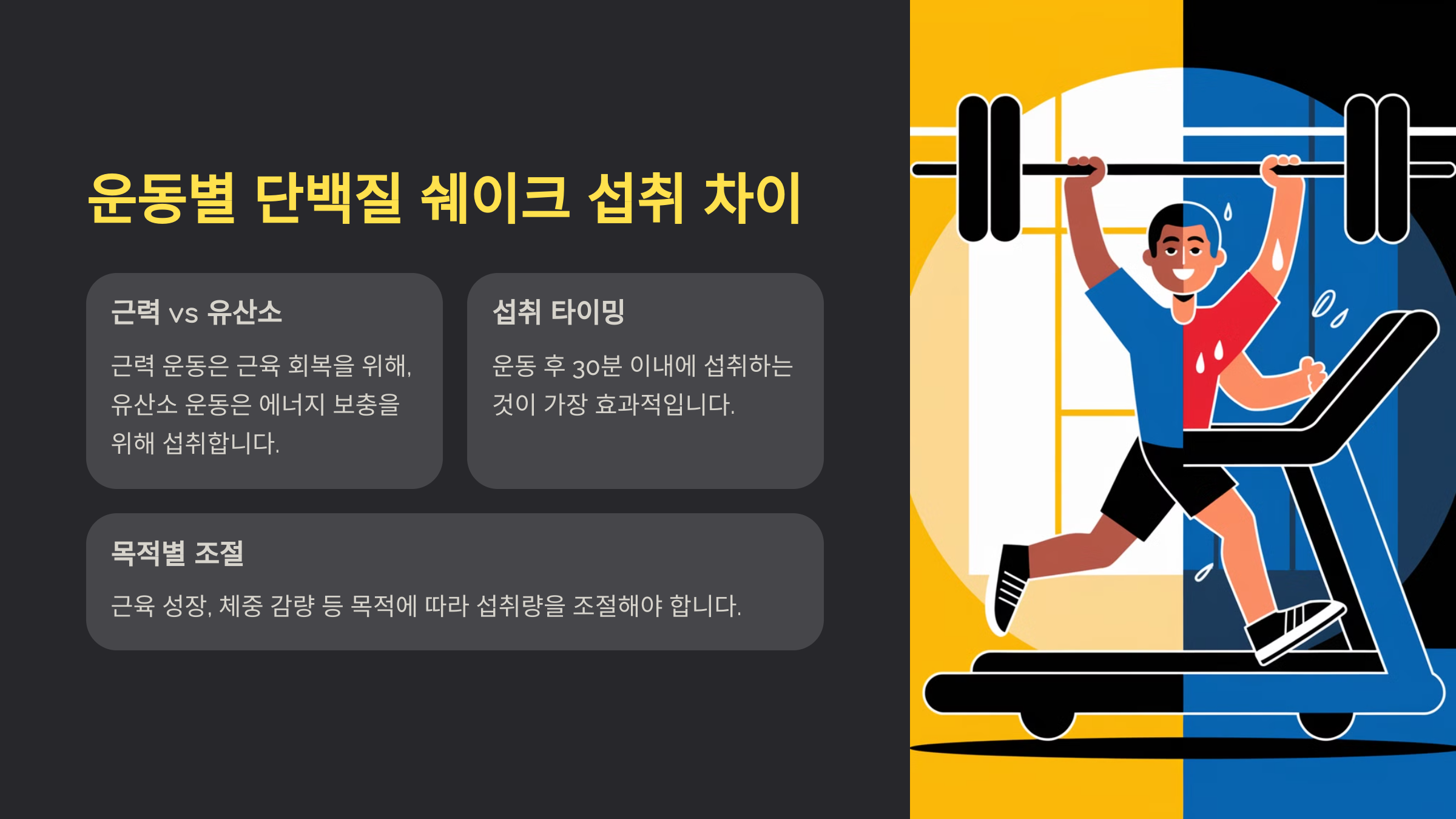 그럼, 유산소 운동과 근력 운동을 할 때 단백질 섭취 방식이 달라야 할까요? 다음 섹션에서 운동별 단백질 쉐이크 섭취 차이를 알아볼게요! 🏃‍♂️