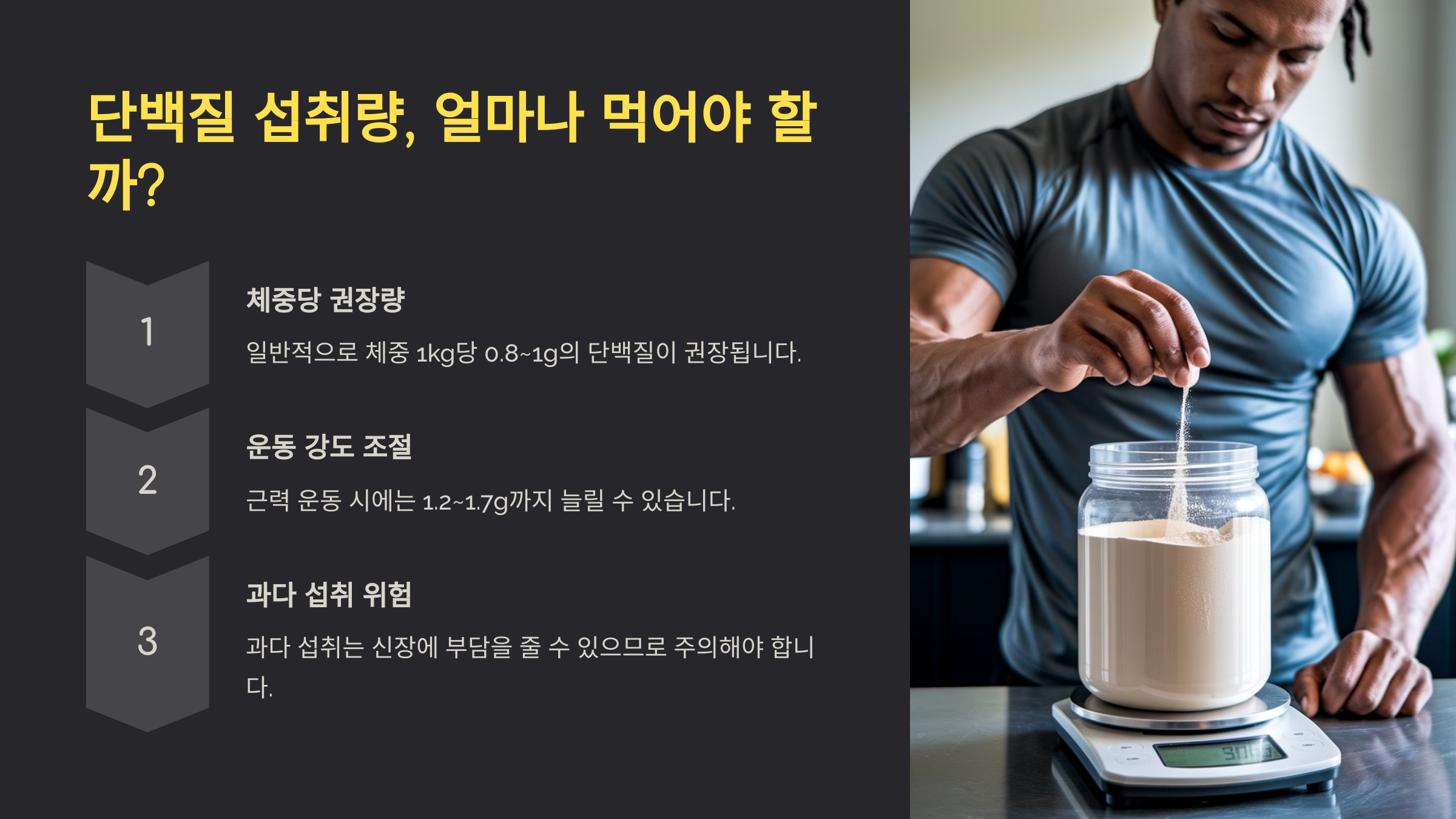 그럼, 단백질 섭취량은 어느 정도가 적당할까요? 너무 많이 먹으면 체지방으로 전환될 수도 있어요. 다음 섹션에서 단백질 섭취량에 대해 자세히 알아볼게요! 🔍