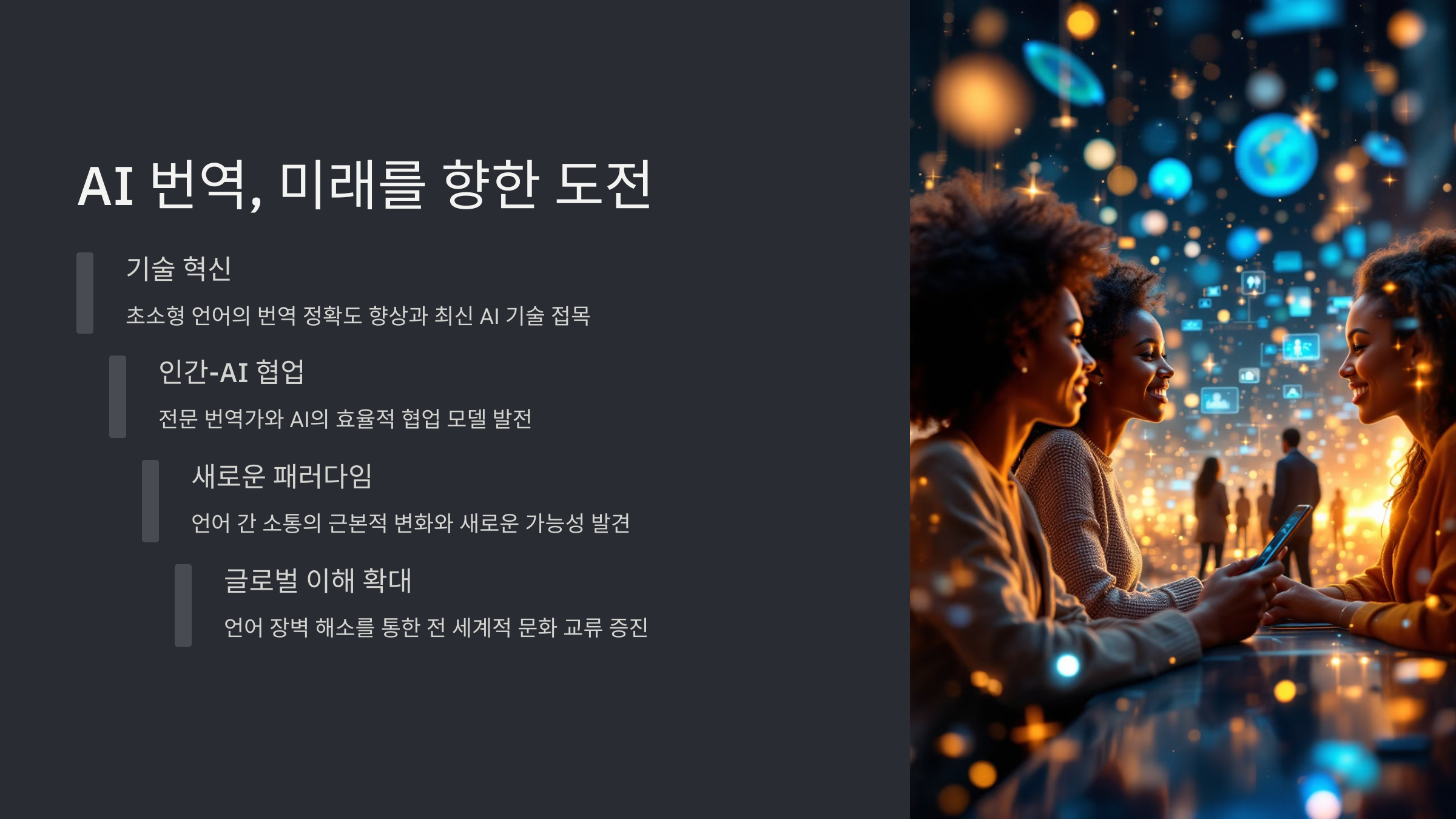 AI 번역 기술은 이제 단순한 텍스트 번역을 넘어 음성 번역까지 가능해졌어요. 과거에는 우리가 직접 입력해야 번역이 가능했지만, 이제는 스마트폰이나 번역기 기기를 통해 실시간 음성 번역이 가능해졌죠. 🎙️