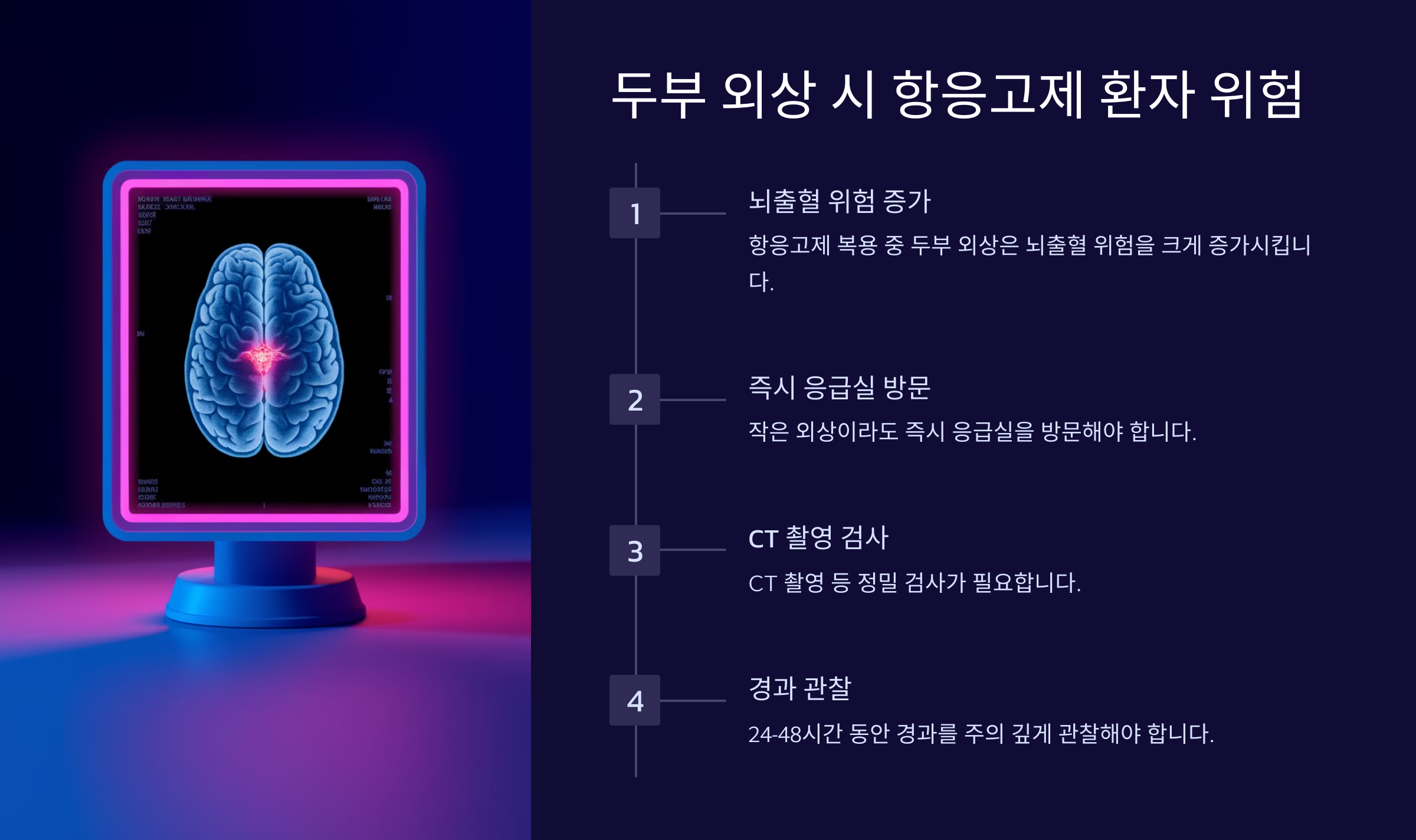 2️⃣ CT 촬영 필수: 항응고제를 복용 중이라면 작은 충격도 뇌출혈을 일으킬 수 있어요. CT 촬영을 통해 내부 출혈 여부를 확인해야 해요.