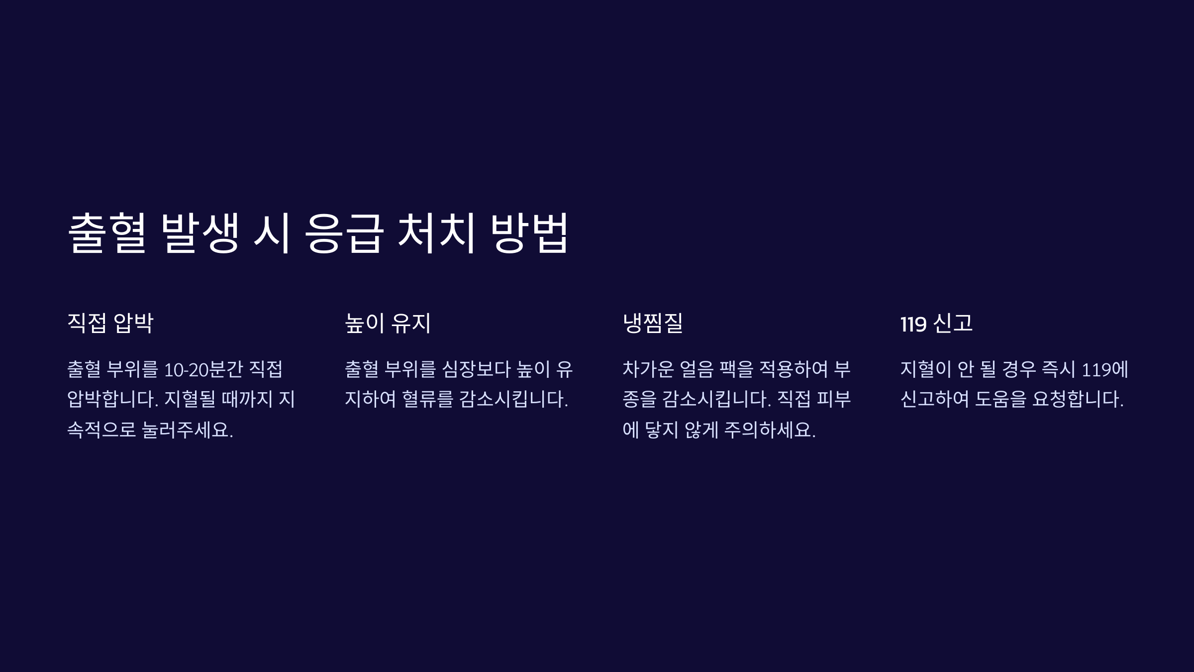 | 팔·다리 출혈 | 압박 후 부위를 심장보다 높게 | 지속되면 응급실 방문 |