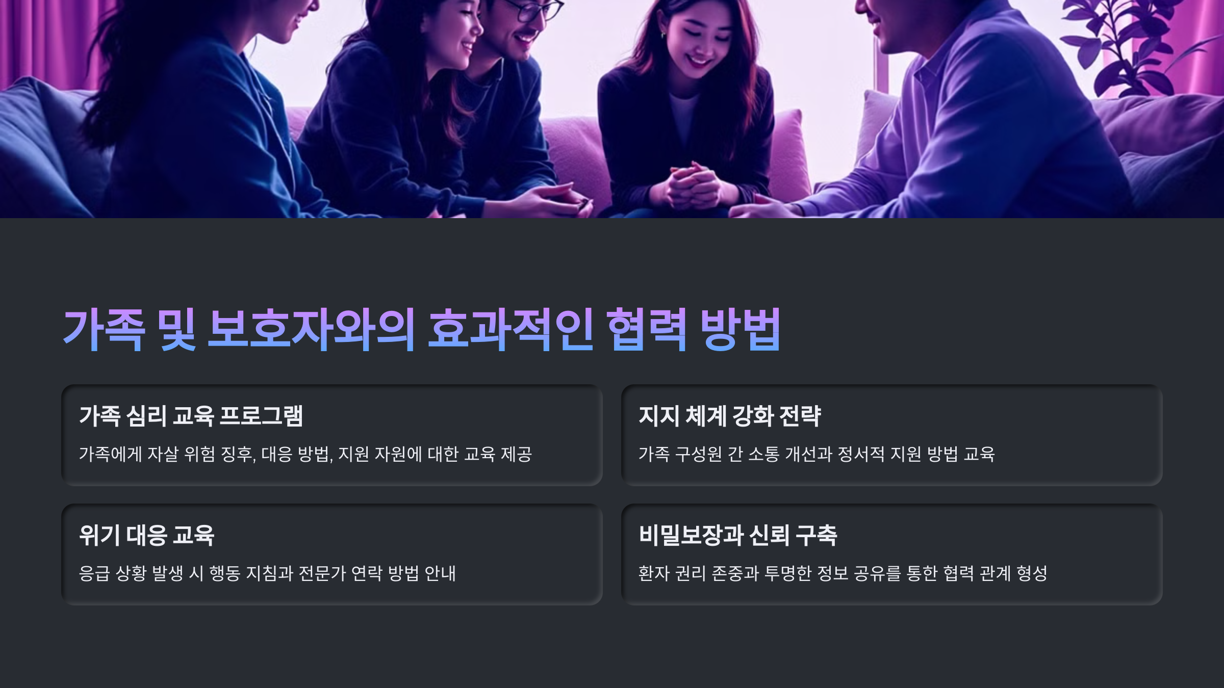 다음 섹션에서는 자살 위험 환자의 가족 및 보호자와 효과적으로 협력하는 방법을 알아볼게요. 보호자와의 소통이 왜 중요한지, 어떻게 접근해야 하는지 함께 살펴봐요! 🤝