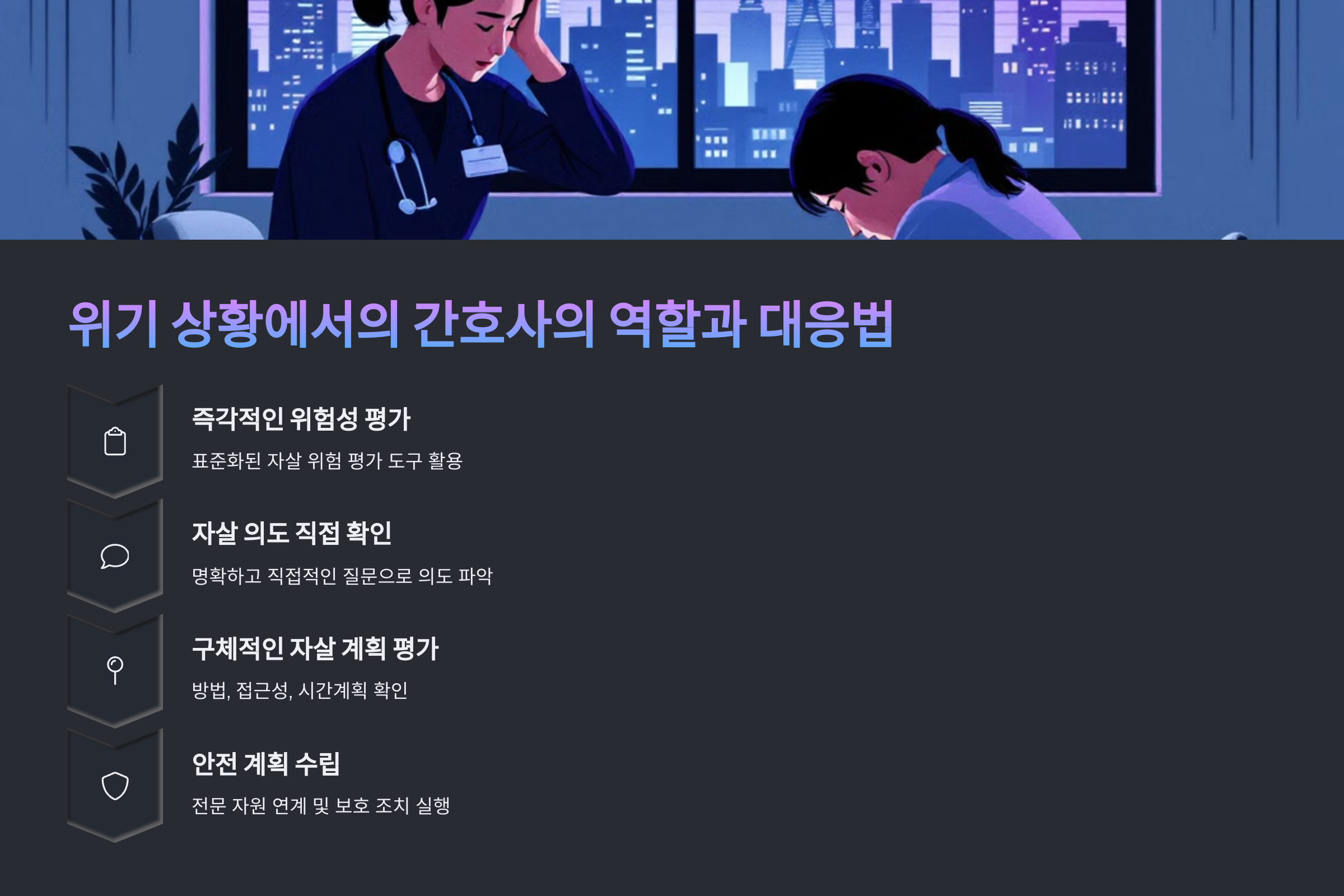 자살 위험 환자가 극단적인 행동을 보이거나, 심각한 정신과적 위기 상황이 발생했을 때 간호사의 신속한 대응이 필요해요. 이때의 대처 방법에 따라 환자의 안전과 생명이 결정될 수 있죠.