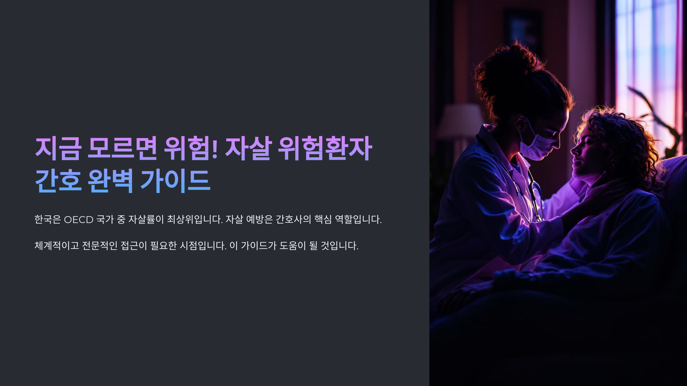 이 가이드는 자살 위험 환자의 간호에 필요한 모든 내용을 다루고 있어요. 각 단계별 전략과 실질적인 대응법을 익혀 실무에 활용할 수 있도록 자세히 설명할게요! 🚑
