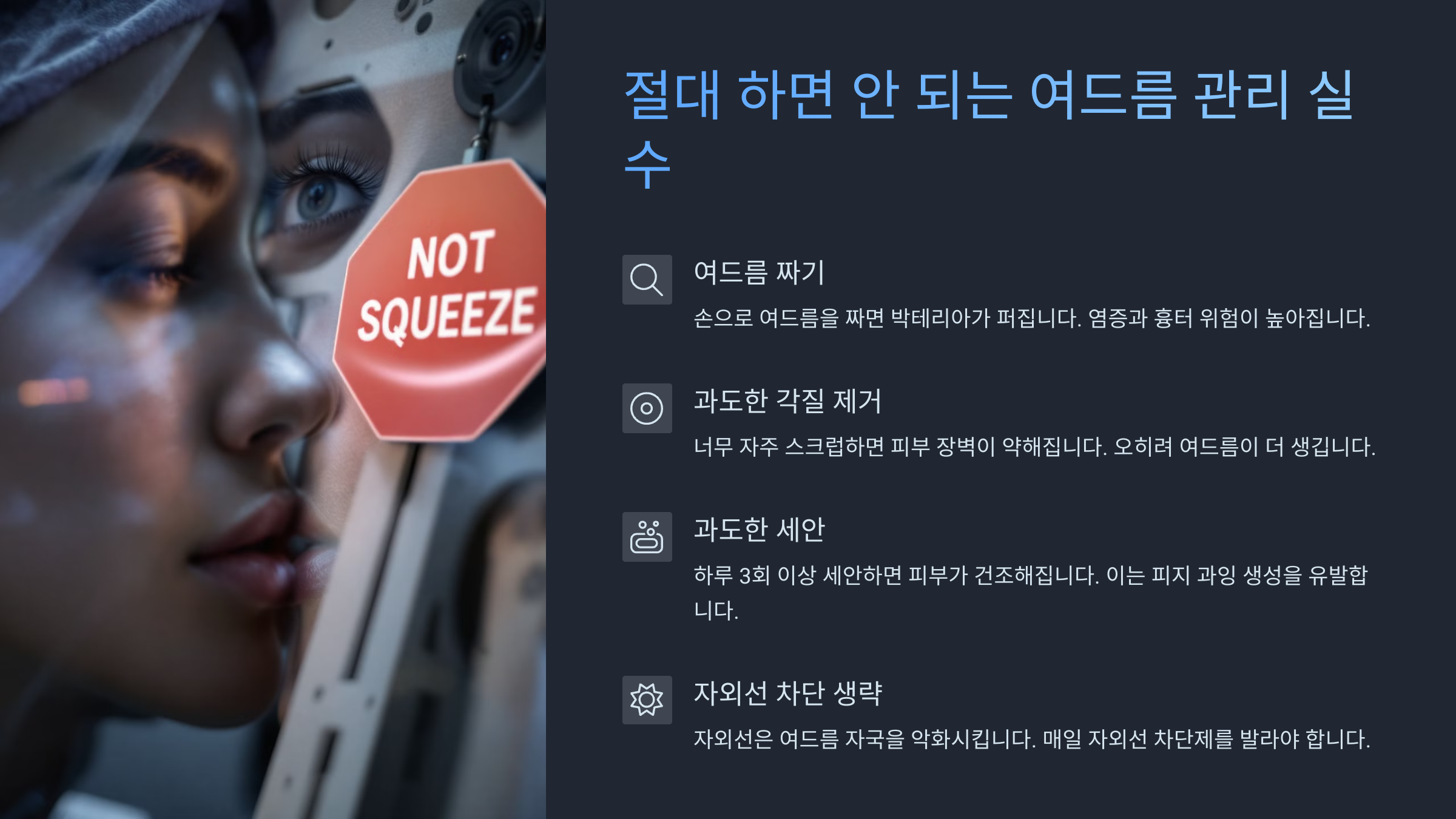 잘못된 관리 습관이 여드름을 악화시킬 수 있어요. 대표적인 실수 몇 가지를 짚어볼게요.