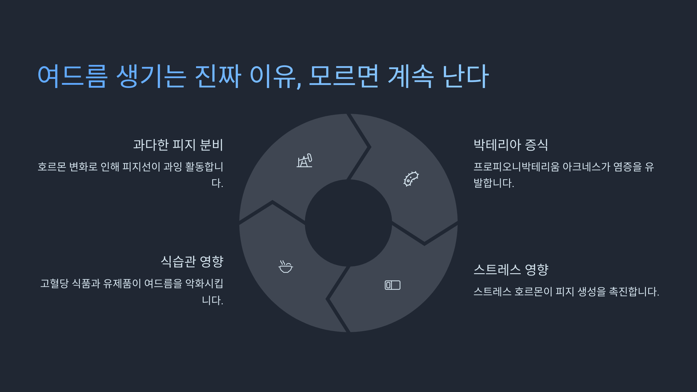 가장 큰 원인은 과도한 피지 분비인데요. 피지가 과하게 생성되면 모공이 막히고 여드름균(프로피오니박테리움 아크네스)이 번식하기 쉬워져요. 결국 염증이 생기면서 붉거나 곪는 형태의 여드름이 발생하죠.