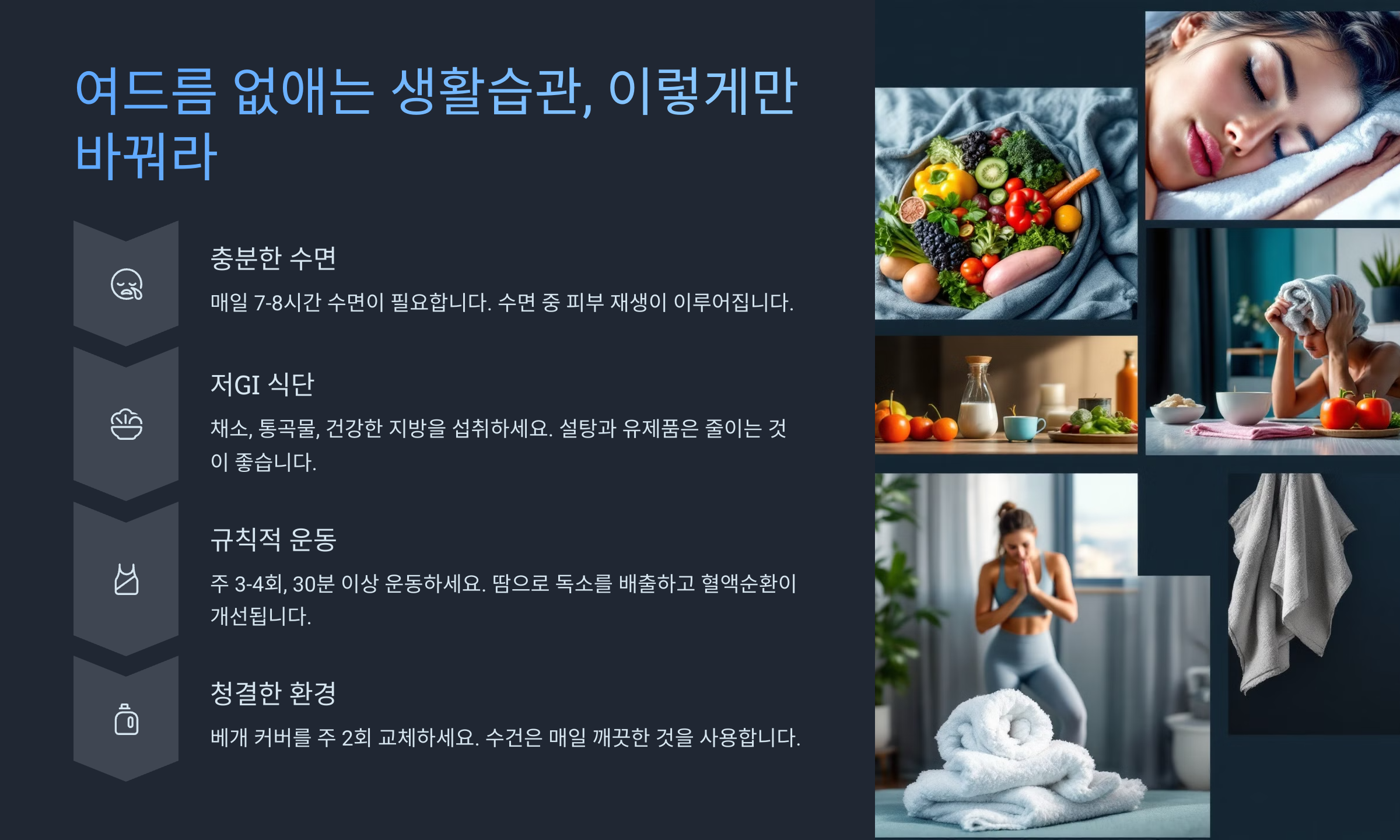 여드름을 없애려면 단순히 약을 바르는 것보다 생활습관을 개선하는 게 중요해요. 피부는 몸 상태를 그대로 반영하기 때문에 건강한 생활습관이 필수랍니다. 😊