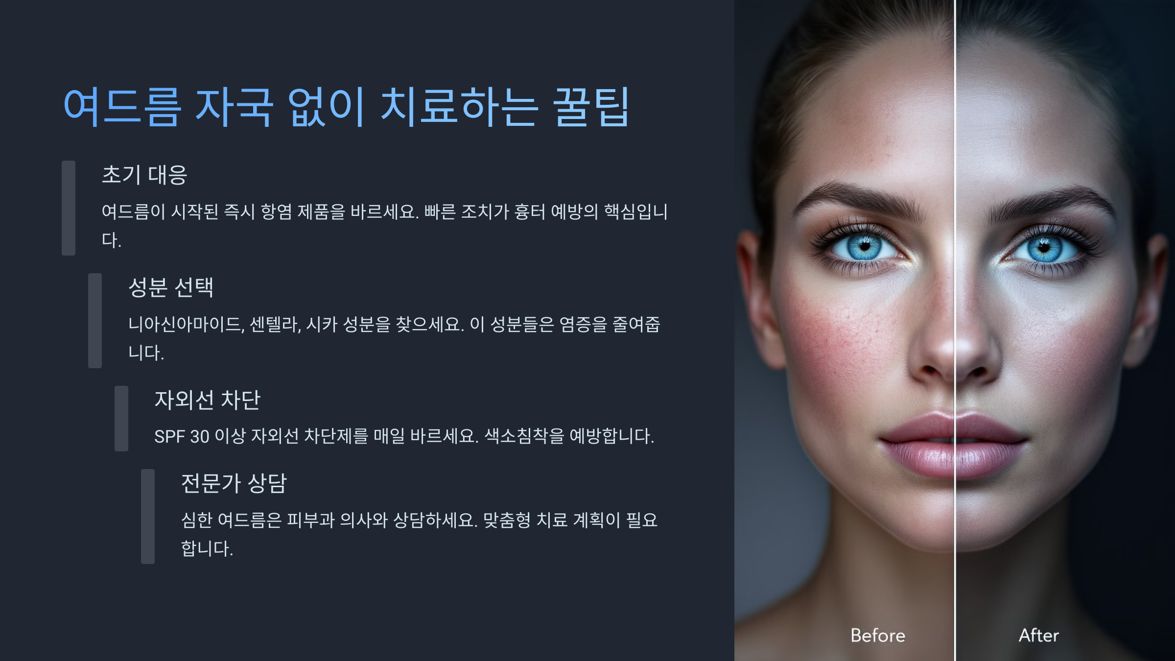 ✔ 자외선 차단 필수: 여드름 자국이 햇빛에 노출되면 더 진해질 수 있어요. SPF 50+의 선크림을 매일 발라주는 게 중요해요. ☀️