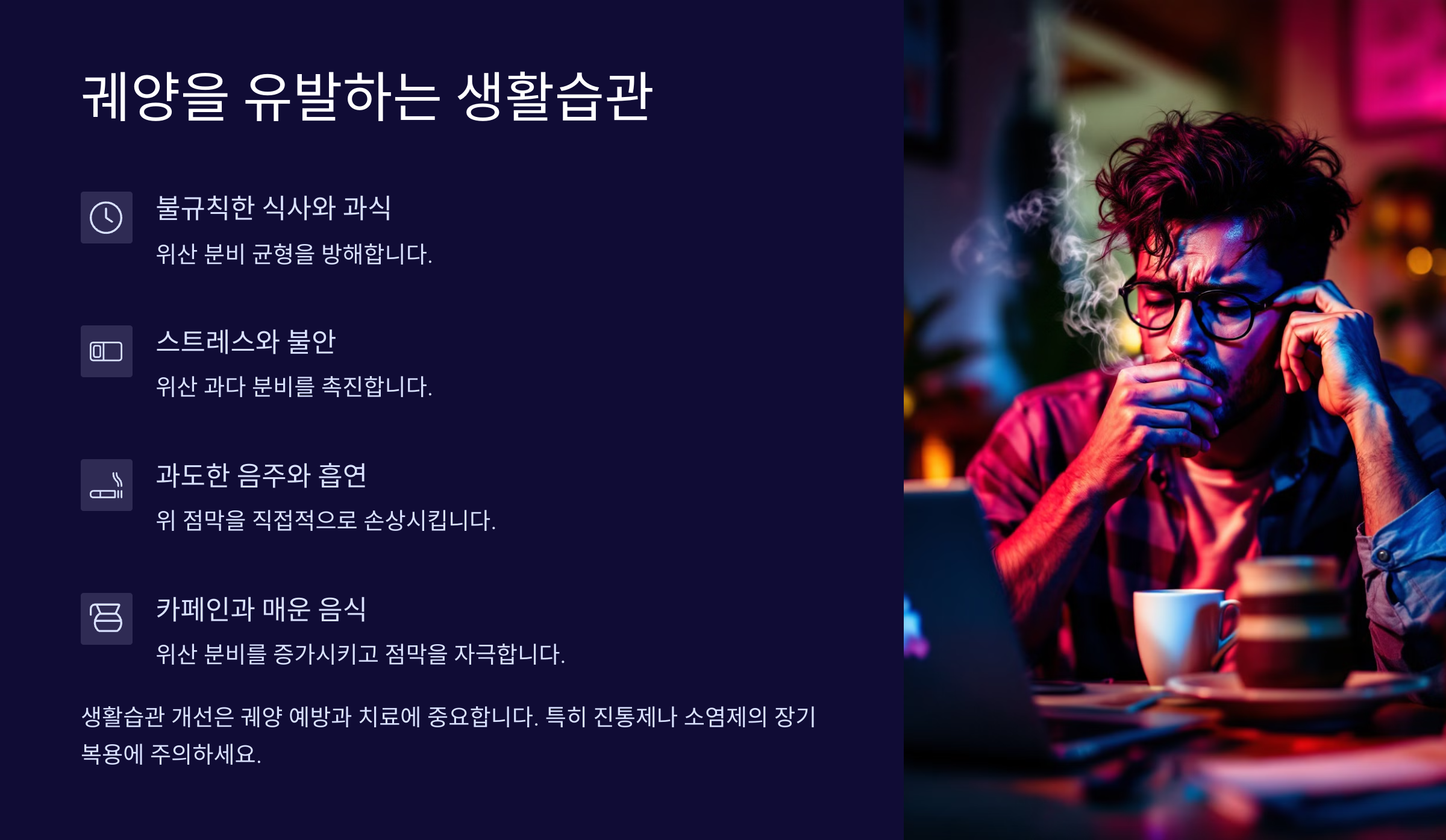 많은 사람들이 궤양을 단순히 위산 문제로 생각하지만, 사실 우리의 일상 습관이 궤양을 키우는 가장 큰 원인이 될 수 있어요. 특히 스트레스, 식습관, 약물 복용 습관이 궤양 발생에 직접적인 영향을 준답니다.