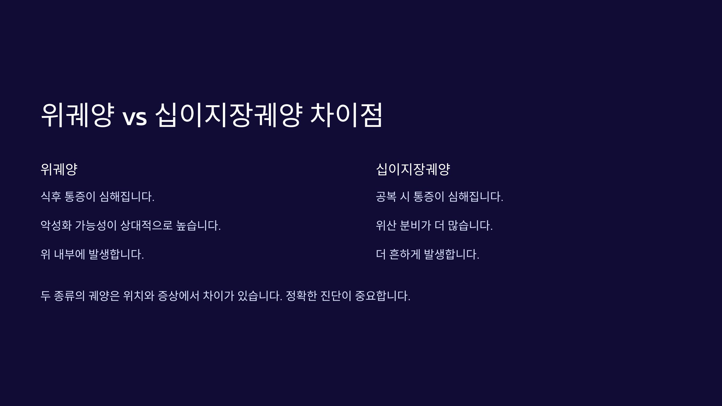 두 궤양의 주요 차이점은 통증이 나타나는 시간이에요. 위궤양은 식사 후에 통증이 심해지는 반면, 십이지장궤양은 공복 상태에서 통증이 심하고, 음식을 먹으면 오히려 완화되는 경향이 있어요.