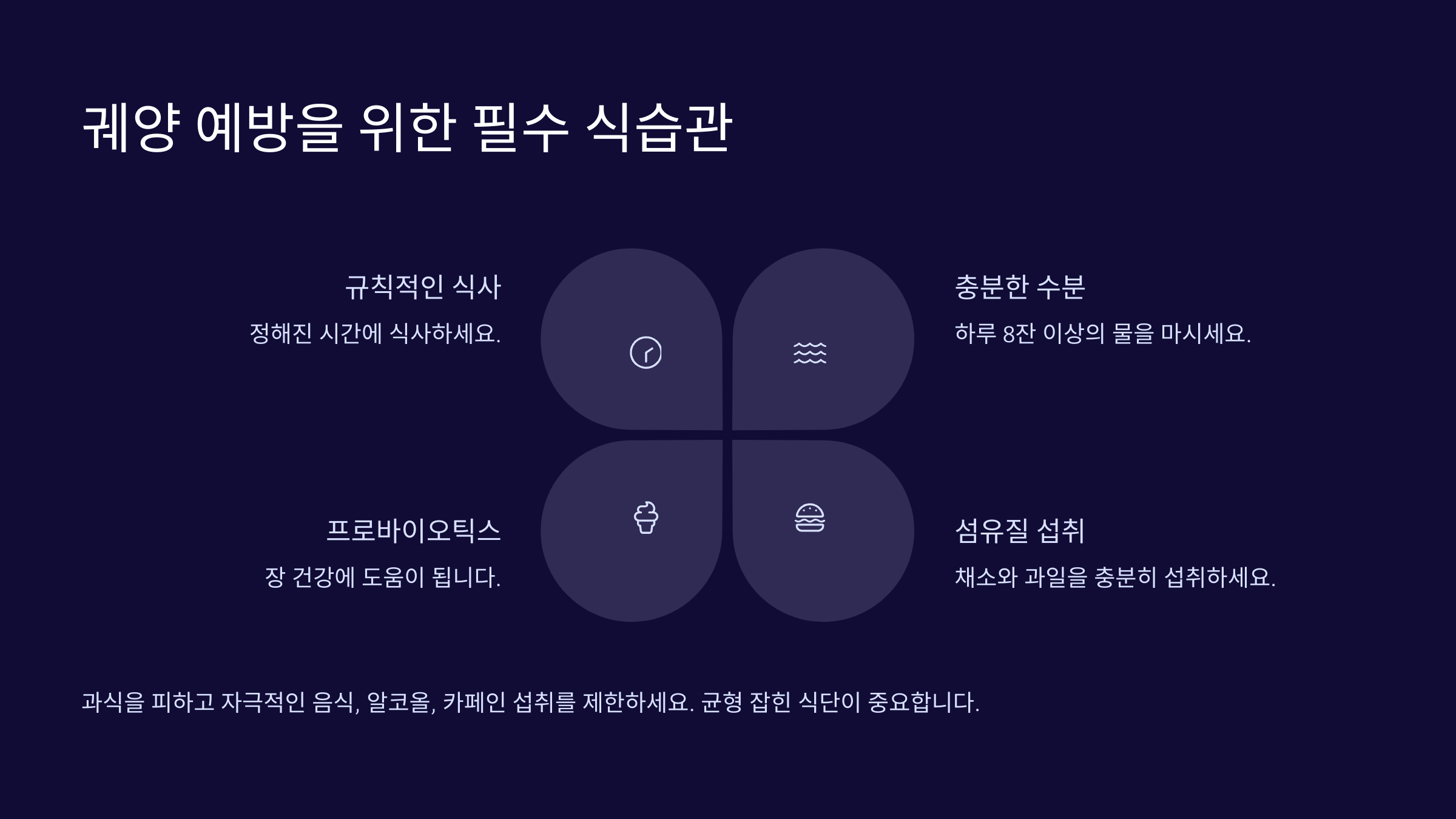 궤양을 예방하려면 위 점막을 보호하고, 위산 분비를 안정적으로 유지하는 식습관이 중요해요. 특히 자극적인 음식과 불규칙한 식사를 피하고, 소화에 좋은 음식을 섭취하는 것이 핵심이랍니다.