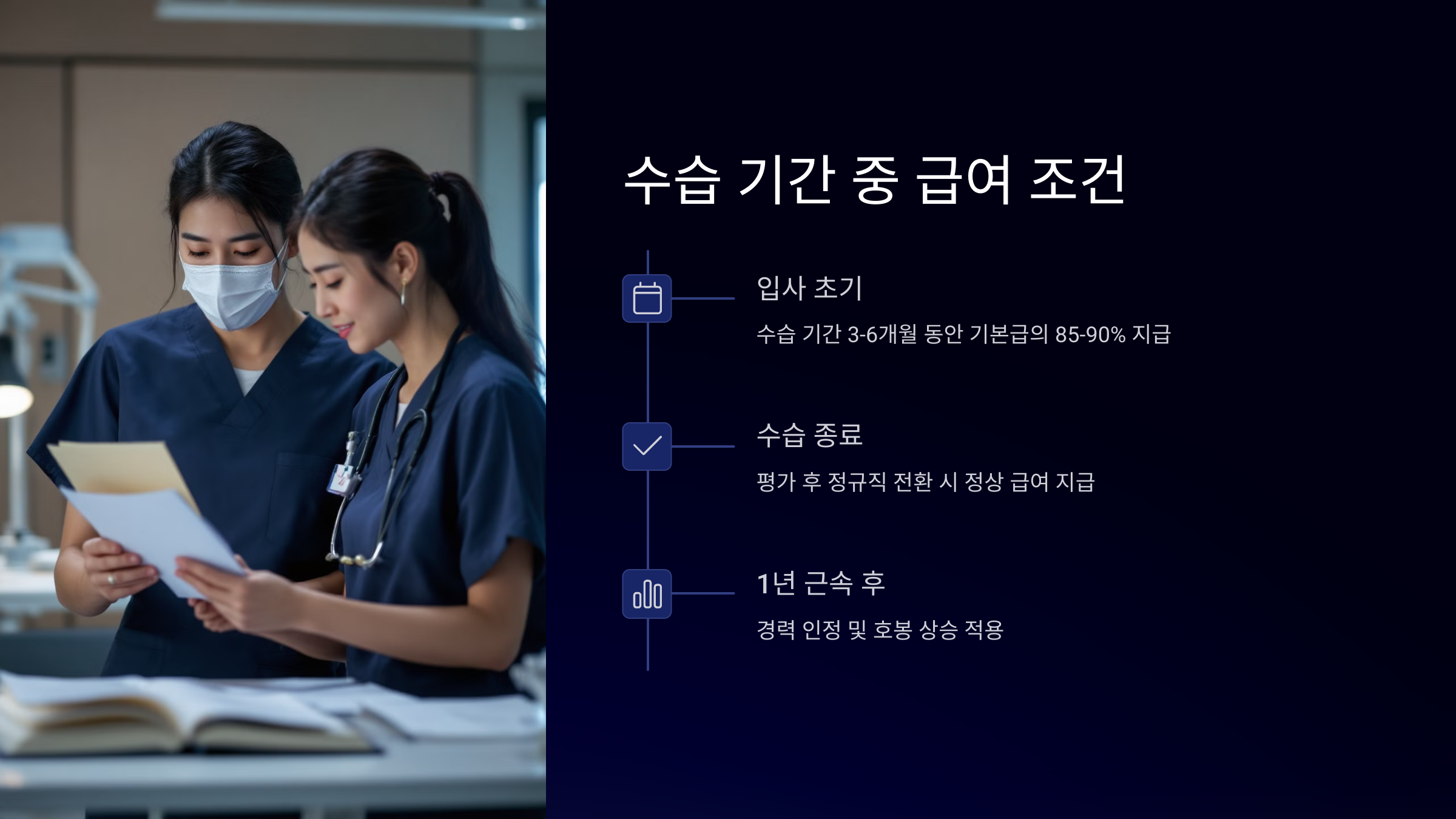 신규 간호사로 병원에 입사하면 대부분 수습 기간을 거쳐요. 일반적으로 3개월 정도인데, 이 기간 동안 급여는 정규 급여보다 적게 지급되는 경우가 많아요. 병원마다 정책은 다르지만, 평균적으로 정규 월급의 80~90% 수준으로 책정되죠.