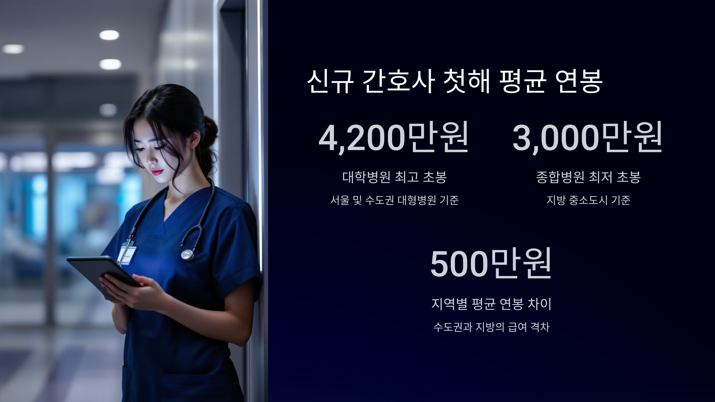 예를 들어 서울의 상급종합병원은 연봉이 4,200만 원 이상까지 올라가기도 해요. 반면 전라, 강원, 경북 지역의 중소병원은 수당 포함 연봉이 3,000만 원 중반대인 경우도 많아요. 지방일수록 간호사 인력이 부족한 경우가 많지만, 연봉이 반드시 높지는 않다는 점이 아이러니하죠.