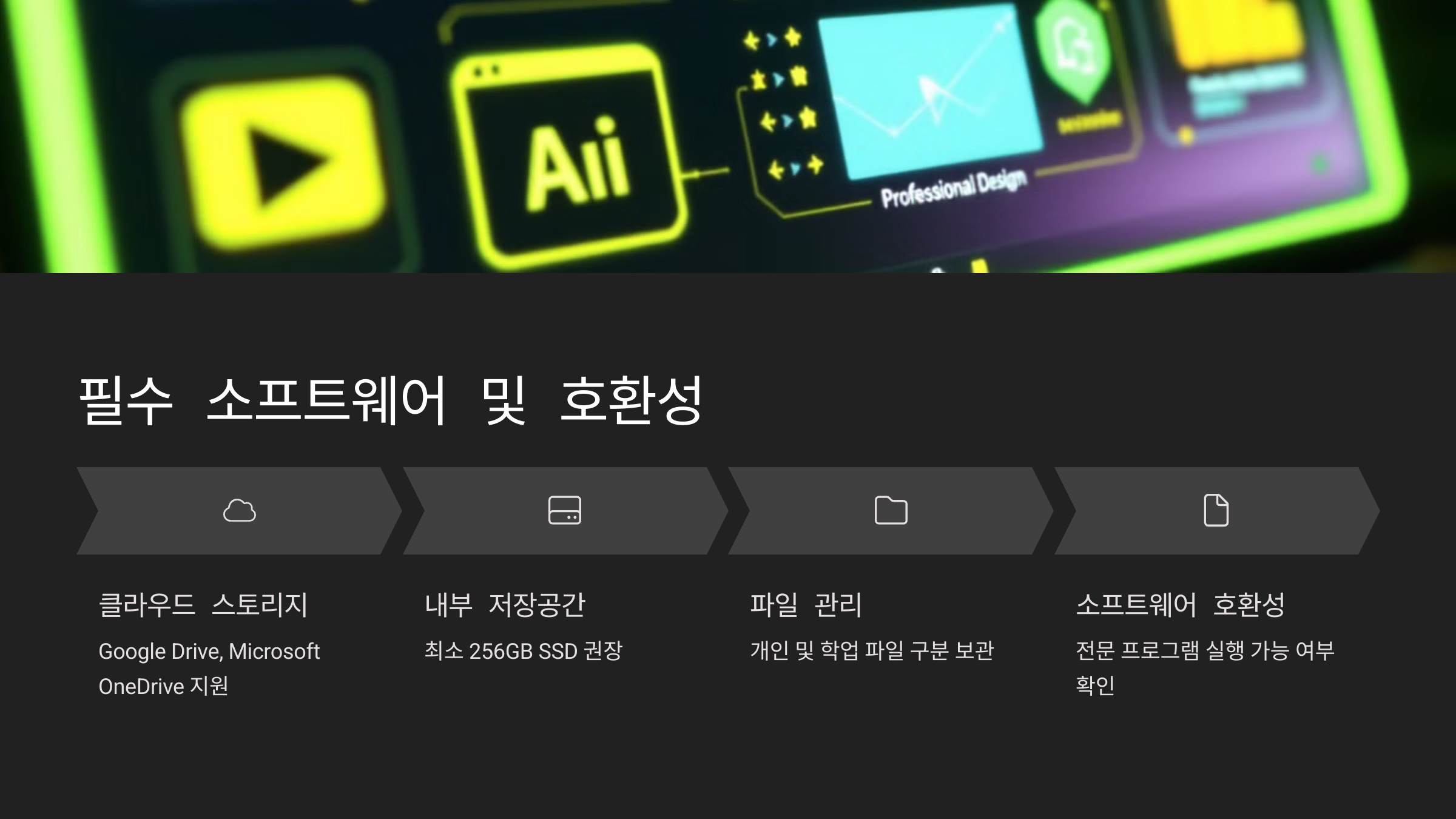 운영체제(OS)는 윈도우와 맥OS 중에서 선택하게 되는데, 각각의 장단점이 있어요. 윈도우는 호환성과 가성비, 맥은 디자인, 보안, 애플 생태계 연동성이 강점이에요. 특히 미디어나 디자인 계열 학생들은 맥북을 선호하는 경우가 많죠. 반면 실무 프로그램 호환성 때문에 윈도우가 필요한 경우도 많으니 자신의 수업 내용을 고려해서 선택해야 해요.