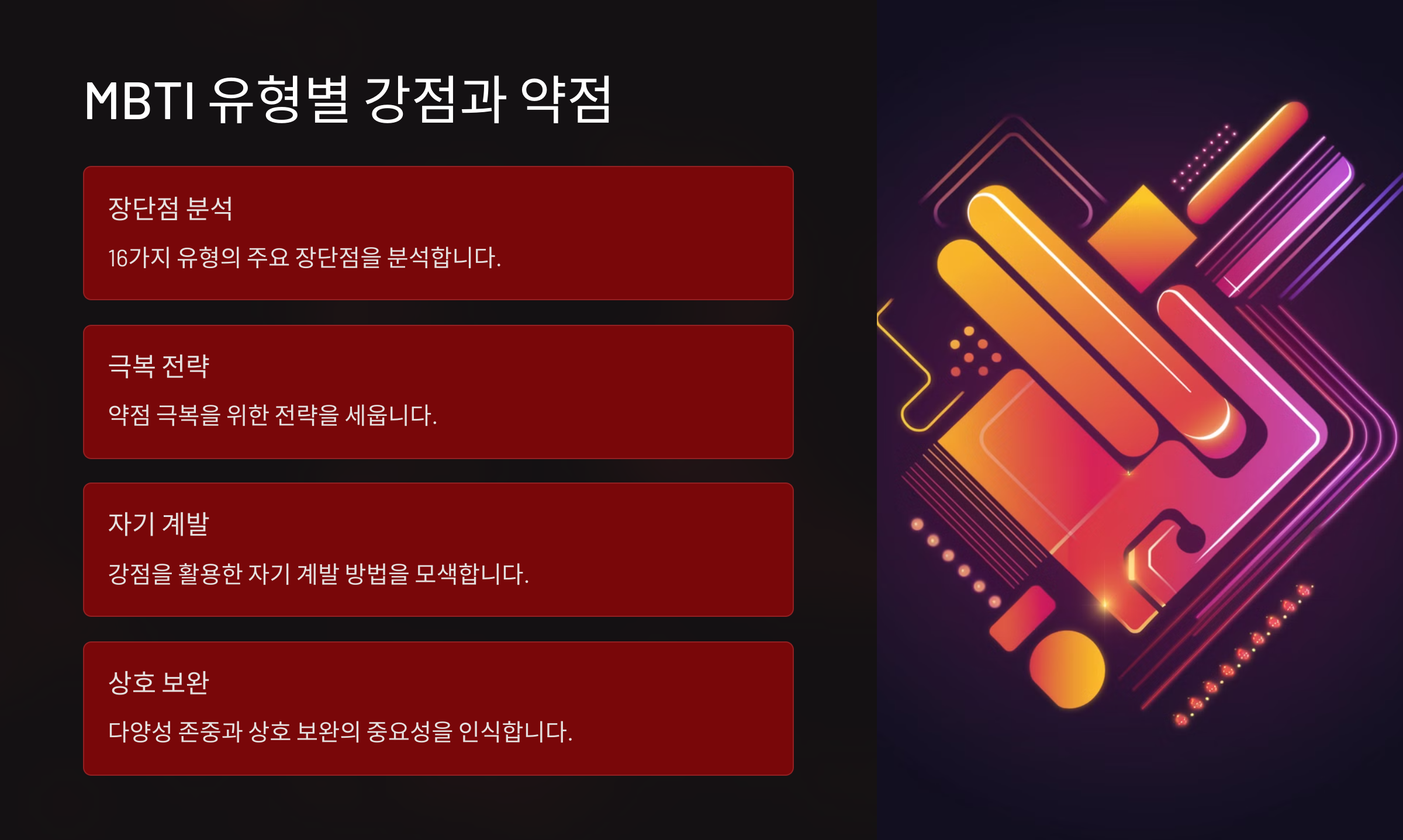 MBTI는 단순한 성격 유형 검사가 아니라, 개인의 강점과 약점을 파악하는 좋은 도구예요! 😊 각 유형별로 어떤 장점과 단점이 있는지 알아볼까요?