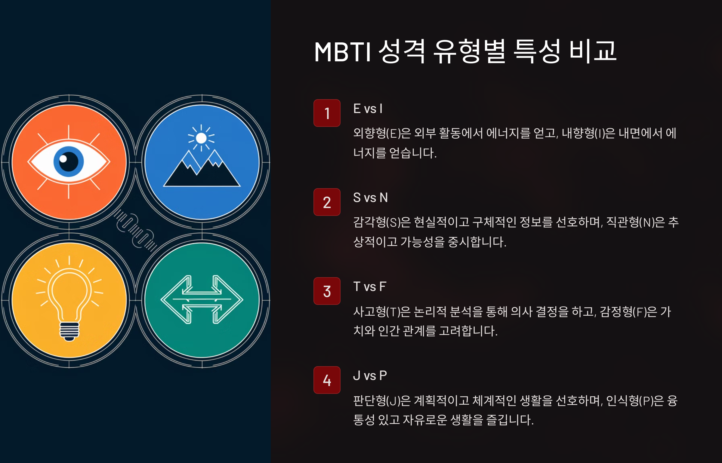 MBTI는 다음 네 가지 기준을 조합하여 성격 유형을 결정해요: