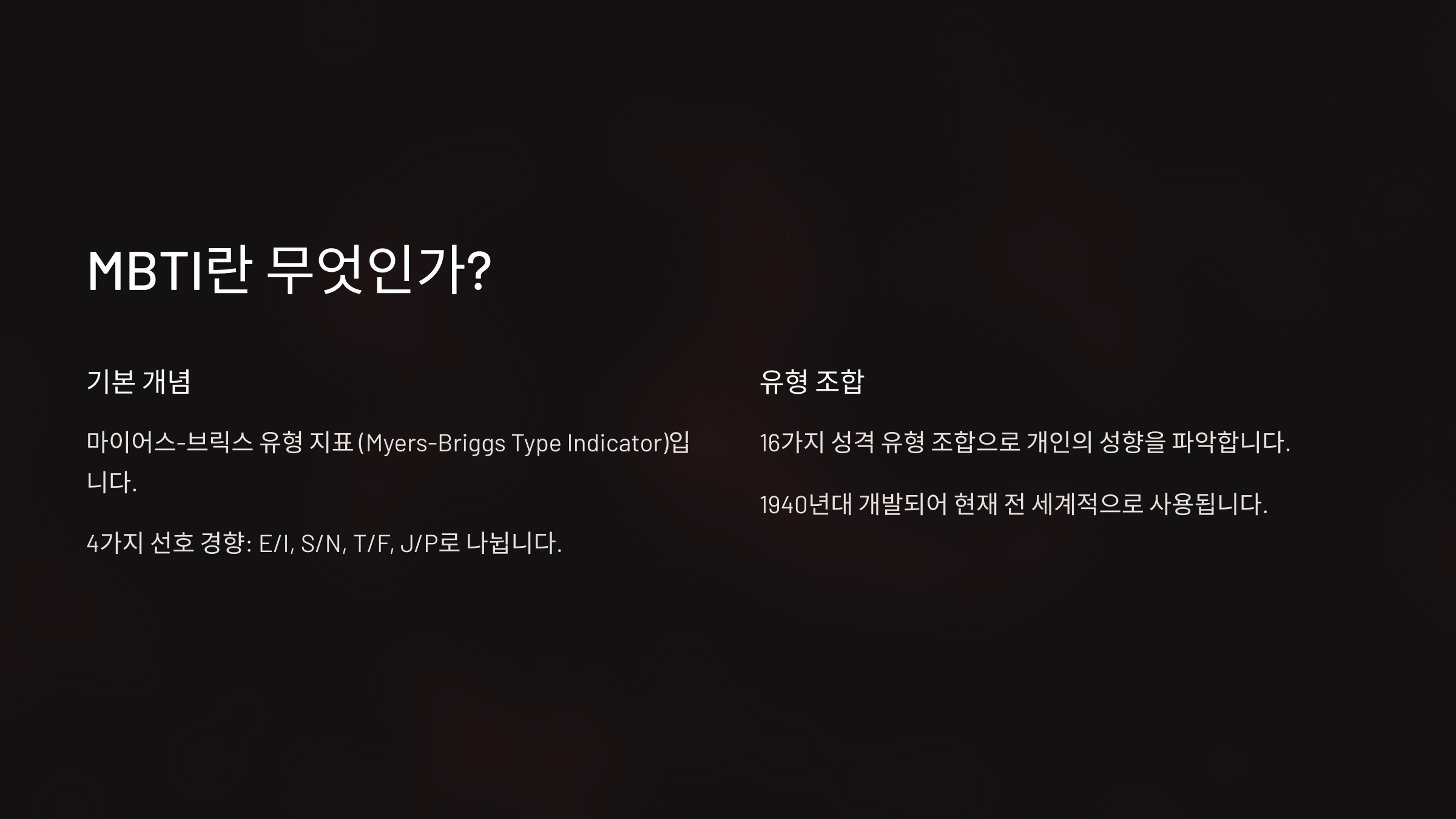 MBTI(Myers-Briggs Type Indicator)는 개인의 성격을 16가지 유형으로 분류하는 검사예요. 이 검사는 심리학자 칼 융(Carl Jung)의 심리 유형 이론을 바탕으로 개발되었으며, 캐서린 쿡 브릭스(Katharine Cook Briggs)와 그녀의 딸 이사벨 브릭스 마이어스(Isabel Briggs Myers)에 의해 구체화되었어요. 🔍